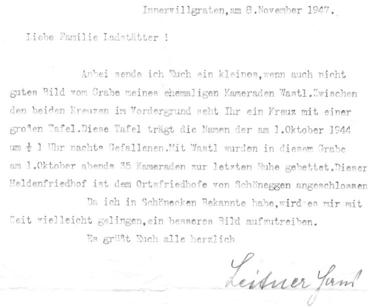 Schreiben des Lehrers und Kriegskameraden Hans Leitner an die Familie Ladstätter |