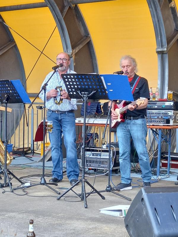 | Auf der Görresbühne: oben Original Eppichhofer Musikanten, unten Roland Metzen und Klaus Wallerius | ||